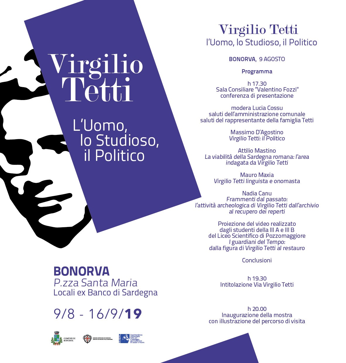 Venerdì 9 agosto, a partire dalle ore 17.30, l’amministrazione comunale di Bonorva, in collaborazione con la Soprintendenza Archeologia, belle arti e paesaggio per le province di Sassari e Nuoro e con il patrocinio della Regione Autonoma della Sardegna, organizza una giornata in onore di Virgilio Tetti.